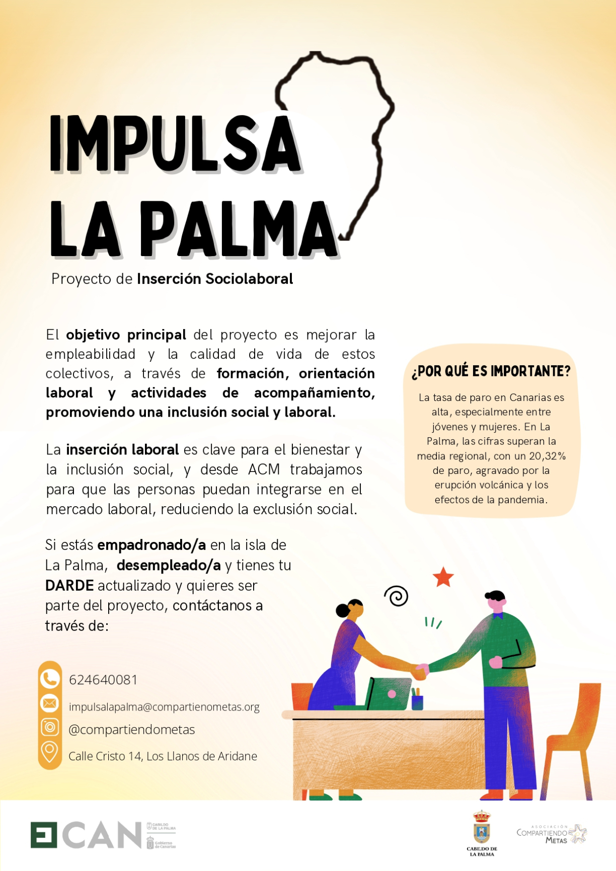 Nos emociona presentar IMPULSA LA PALMA, nuestro proyecto de inserción sociolaboral en La Palma. Este programa tiene como objetivo principal mejorar la empleabilidad y la calidad de vida de los colectivos que más lo necesitan, a través de formación, orientación laboral y actividades de acompañamiento, buscamos promover una inclusión social y laboral real y duradera. 🤝